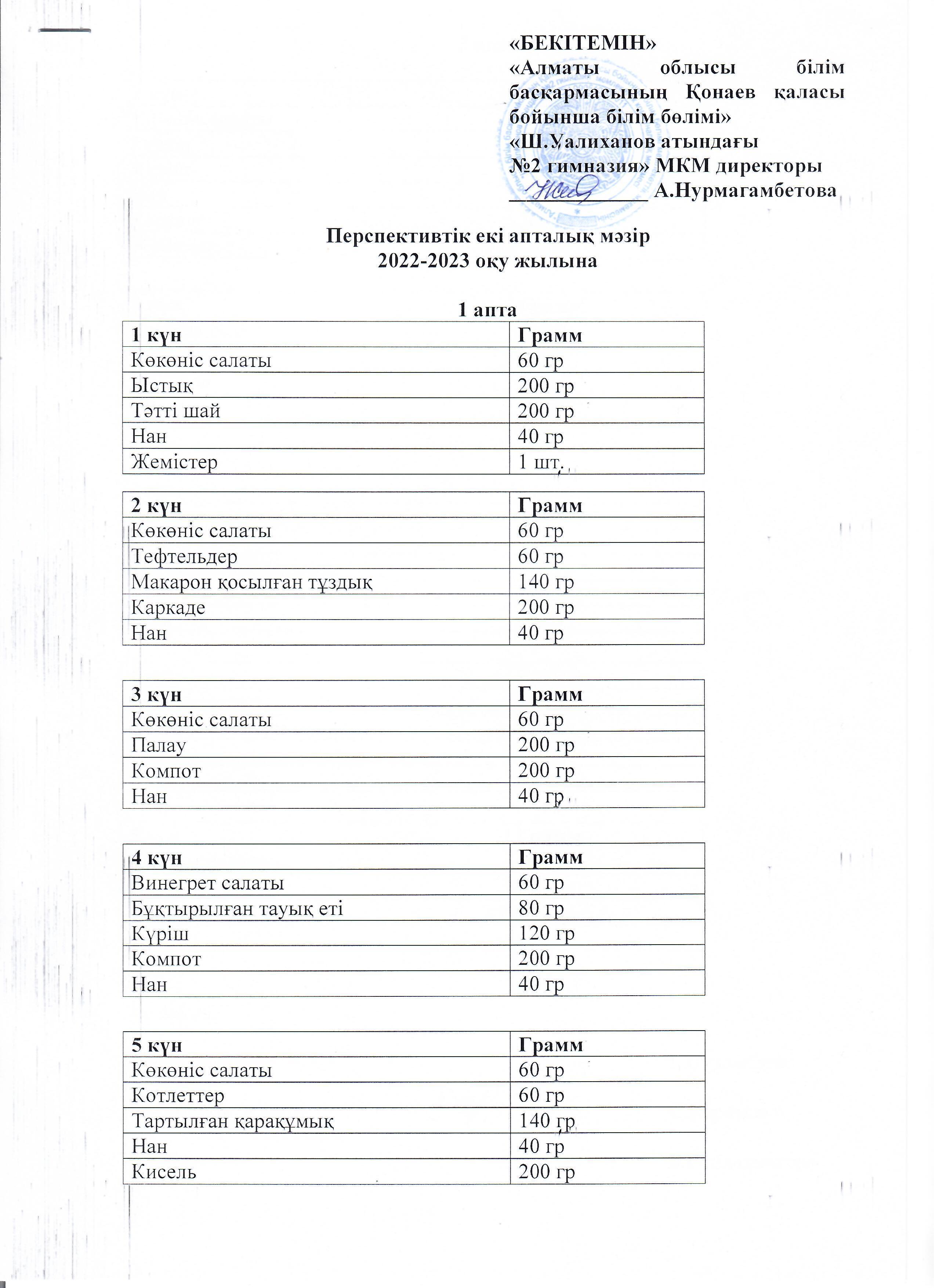 Перспективтіқ екі апталық мәзір » Ш. Уалиханов атындағы №2 гимназия