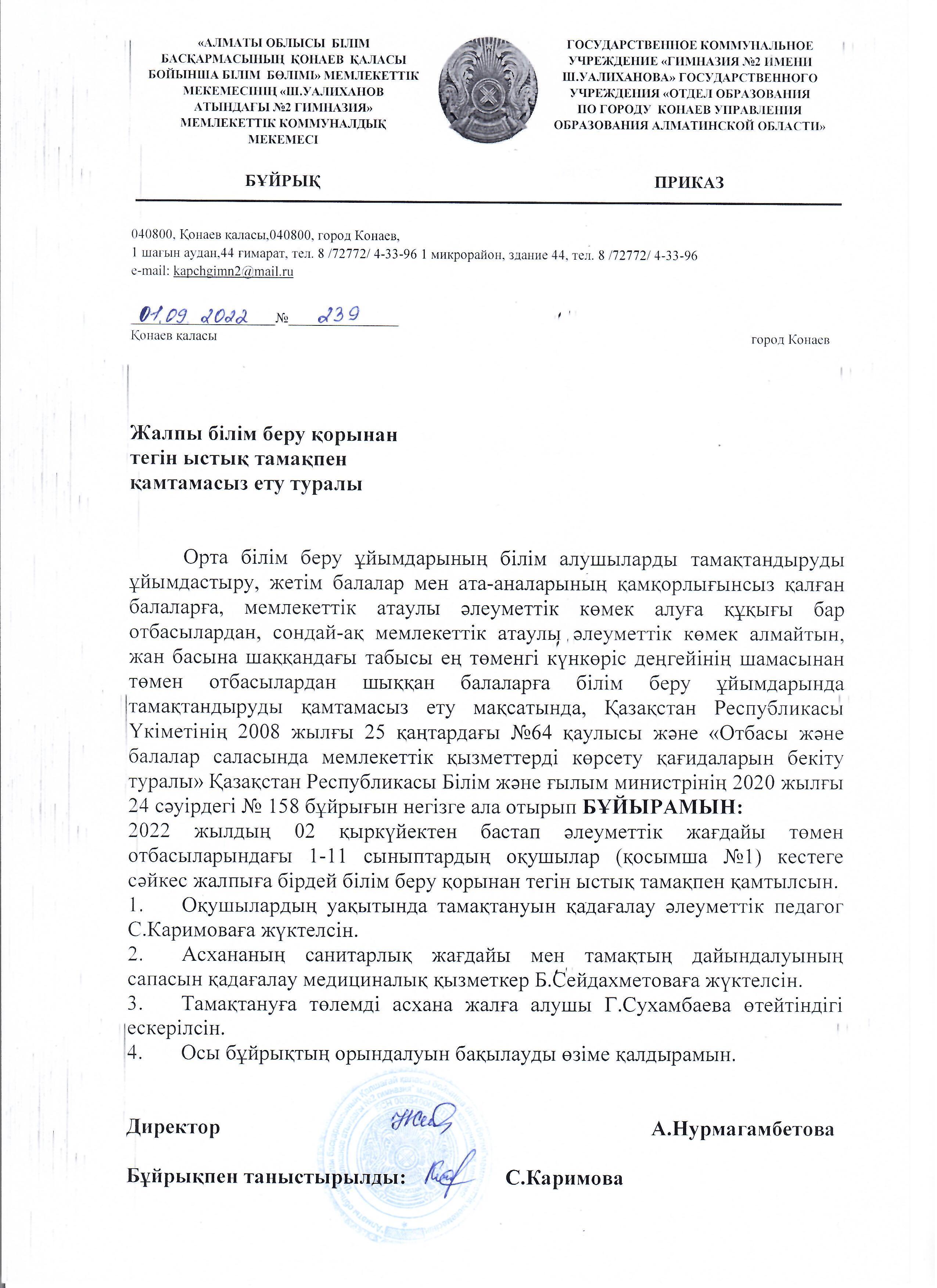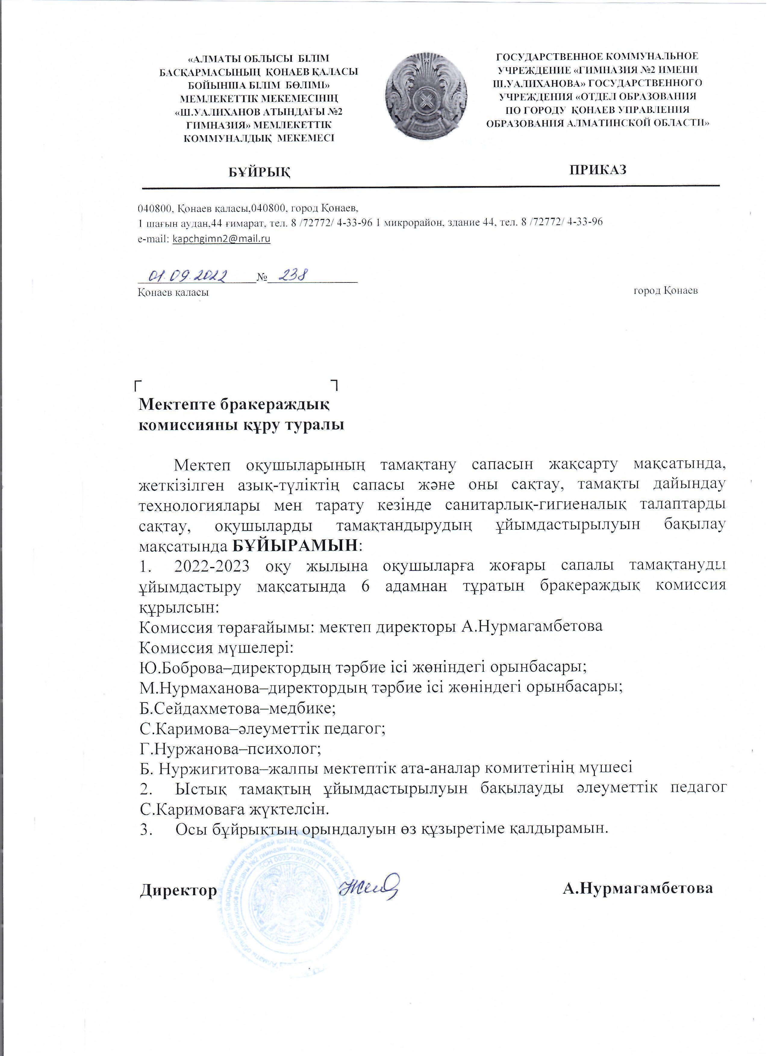 Тегін ыстық тамақпен қамтамасыз ету туралы бұйрықтар » Ш. Уалиханов атындағы №2 гимназия