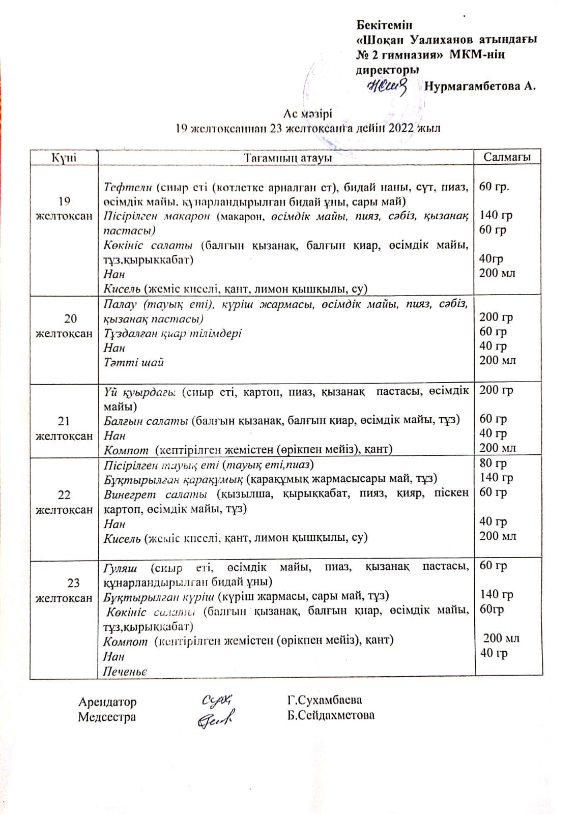 19 желтоқсаннан 23 желтоқсанға дейін ас мәзірі » Ш. Уалиханов атындағы №2 гимназия