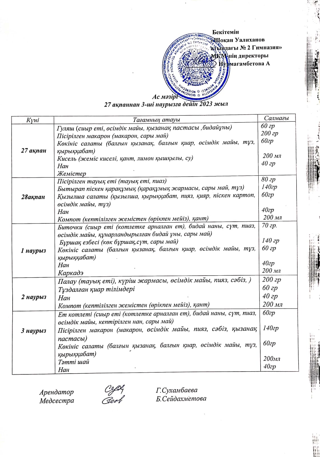 27 ақпаннан 03 наурызға дейін ас мәзірі. » Ш. Уалиханов атындағы №2 гимназия